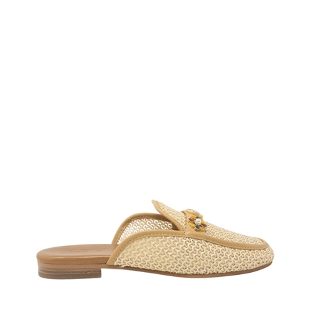 Quick view INUOVO women's flat sabot... €119.00 A sabot with a boho-chic spirit, light as a summer breeze.The woven raffia workmanship, the leather profile and the floral application with side...