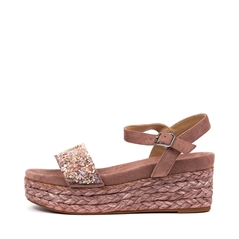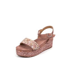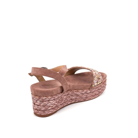Alma Blue woman wedge sandal in pink suede, embellished with stones and rhinestones on the upper and wedge covered in rope